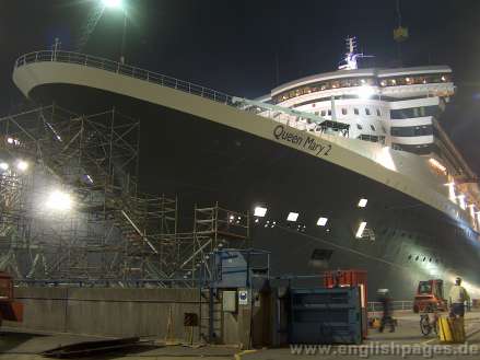 QM2 leaves Hamburg at 6:00am on the 19th November 2005 on a bitter cold foggy morning. Just before 5am the fog lifted to unviel the QM2 in her full glory. With steam rising from the somewhat warmer Elbe, she edged her way backwards out of Elbe Dock 17 and almost up to the Cruise Terminal. After a short stop she moved quickly downriver out of Hamburg towards Cuxhaven and further on to Southampton. The QM2 photos were taken from 4:20am to 06:30am. Photos taken by nicolls d.zine for Hamburg English Pages - www.nicolls.de. All rights reserved (C). The quality in the slideshow is less than the originals. The size of the data and the dimensions have been greatly reduced. ENQUIRIES about using the photos are welcome. Prices on request. Charges will be made for photos used without permission.
