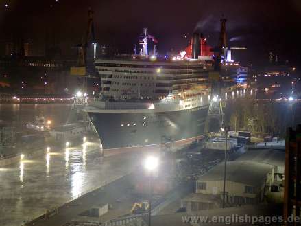 QM2 leaves Hamburg at 6:00am on the 19th November 2005 on a bitter cold foggy morning. Just before 5am the fog lifted to unviel the QM2 in her full glory. With steam rising from the somewhat warmer Elbe, she edged her way backwards out of Elbe Dock 17 and almost up to the Cruise Terminal. After a short stop she moved quickly downriver out of Hamburg towards Cuxhaven and further on to Southampton. The QM2 photos were taken from 4:20am to 06:30am. Photos taken by nicolls d.zine for Hamburg English Pages - www.nicolls.de. All rights reserved (C). The quality in the slideshow is less than the originals. The size of the data and the dimensions have been greatly reduced. ENQUIRIES about using the photos are welcome. Prices on request. Charges will be made for photos used without permission.
