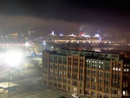 QM2 leaves Hamburg at 6:00am on the 19th November 2005 on a bitter cold foggy morning. Just before 5am the fog lifted to unviel the QM2 in her full glory. With steam rising from the somewhat warmer Elbe, she edged her way backwards out of Elbe Dock 17 and almost up to the Cruise Terminal. After a short stop she moved quickly downriver out of Hamburg towards Cuxhaven and further on to Southampton. The QM2 photos were taken from 4:20am to 06:30am. Photos taken by nicolls d.zine for Hamburg English Pages - www.nicolls.de. All rights reserved (C). The quality in the slideshow is less than the originals. The size of the data and the dimensions have been greatly reduced. ENQUIRIES about using the photos are welcome. Prices on request. Charges will be made for photos used without permission.