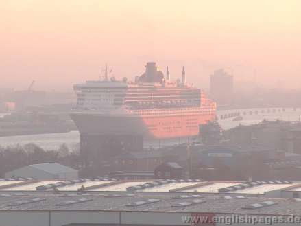 QM2 arrives on 8th November for first 2 yearly service, painting and for maintenance and enters Dock - Elbe 17 at 8am on 9th November with a red sunrise. Photos taken 8th & 9th November 2005. Photos by Chris Nicolls / nicolls d.zine / Hamburg English Pages - see links on this page. All rights reserved. Use of photos requires permission. A charge will be levied for all photos used without permission.
