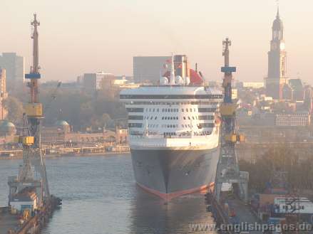 QM2 arrives on 8th November for first 2 yearly service, painting and for maintenance and enters Dock - Elbe 17 at 8am on 9th November with a red sunrise. Photos taken 8th & 9th November 2005. Photos by Chris Nicolls / nicolls d.zine / Hamburg English Pages - see links on this page. All rights reserved. Use of photos requires permission. A charge will be levied for all photos used without permission.