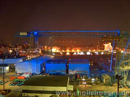 nicolls d.zine - www.nicolls.de. Photos of Queen Mary 2 and the 2006 Hamburg Harbour Birthday - www.hafengeburtstag.de. Photos taken inside Blohm & Voss next to the dry dock, near the QM2 and from the top of a crane near the dry dock. The last few photos were taken from Landungsbrücken, the other side of the river from the dry dock - 22:00hrs to circa 2:00hrs. The blue goals - goal shaped neon lights - are there to mark the World Cup 2006. Thanks to RAIKE Kommunikation GmbH - www.raike.info, ThyssenKrupp Marine Systems, Cunard & Blohm & Voss for the invitation to take photos near the dry dock and for the refreshments. Permission to use or download photos is required. We reserve the right to send a bill/Rechnung to anyone/any company using photos without permission. Prior warning will not be given, if prior warning is not possible. One warning only. All rights reserved.